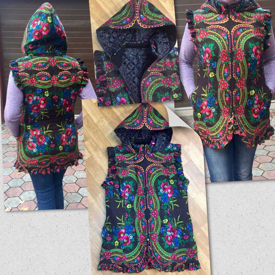 Используя платки с яркой набивкой, можно сшить красивый жилет, как на фото.