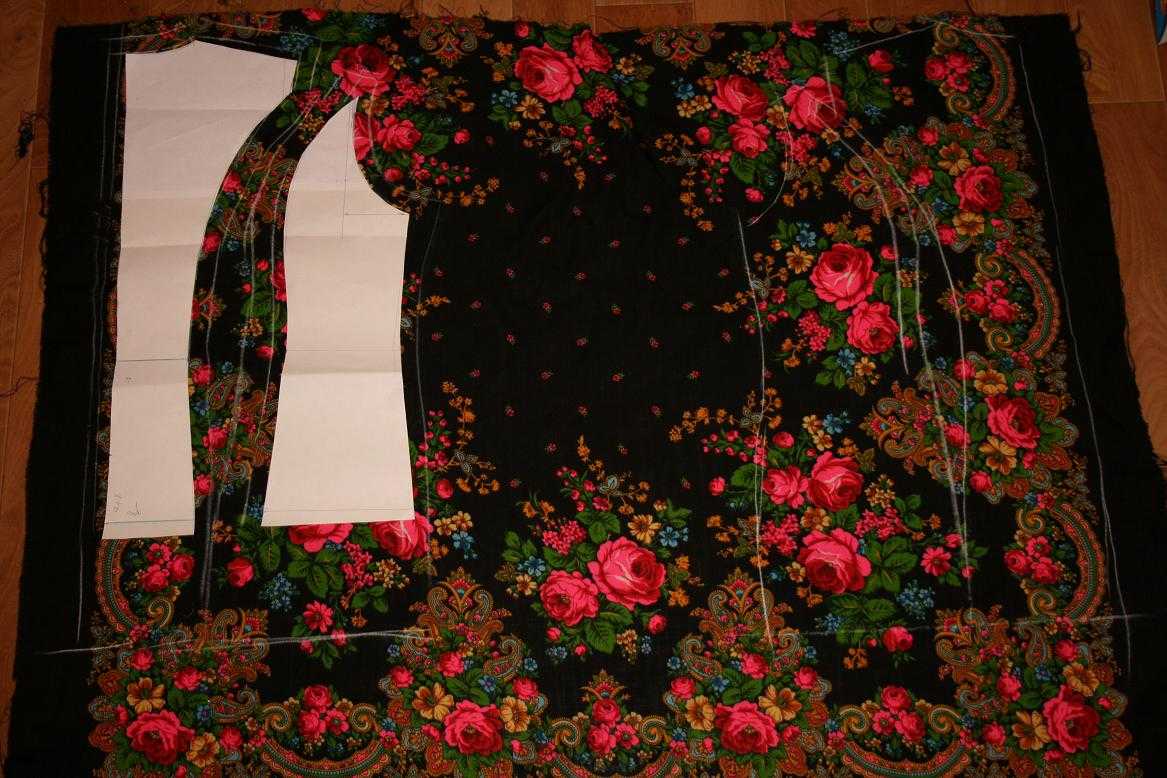 Оригинальный жилет получается из большого павлопосадского платка или кружевной косынки. Используя ниже приведенную схему, сшить его будет легко.