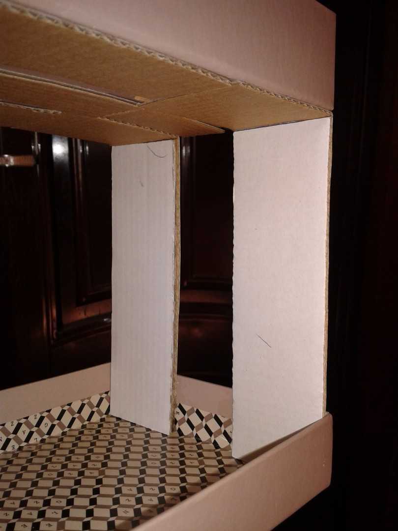 - Вырежьте 4-6 полосок картона длиной, равной высоте шкафа, и шириной, вдвое меньшей, чем ширина шкафа для кукольной одежды.