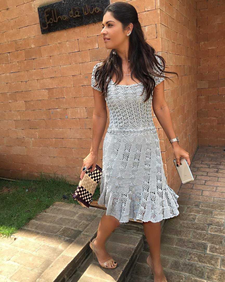 В зависимости от того, какую вы по плотности выбираете вязку, можно будет под низ изделия дополнить ее топом. Его выбор будет зависеть от основного цвета изделия. В случае использования крупной вязки, прекрасно подходит топ нейтрального цвета, к примеру, можно выбрать черный. Удачным будет сочетание тон в тон — изделие под платьем и само платье окажутся в одной цветовой гамме и строго одного оттенка.