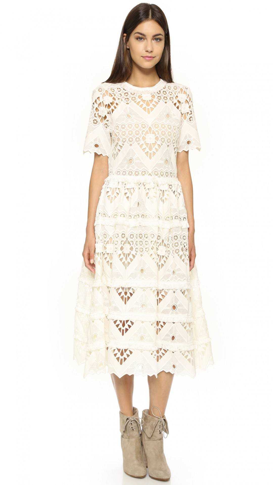 Выбирать стоит объемное ажурное платье, которое не только будет выгодно смотреться на модели, но и его будет легко дополнить. К такому платью прекрасно подходят колготки из плотного материала. Добавим массивные ботинки и образ практически завершен.
